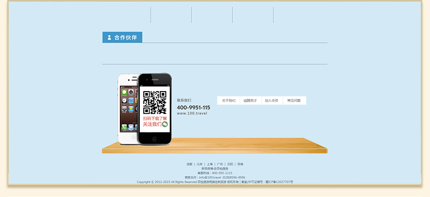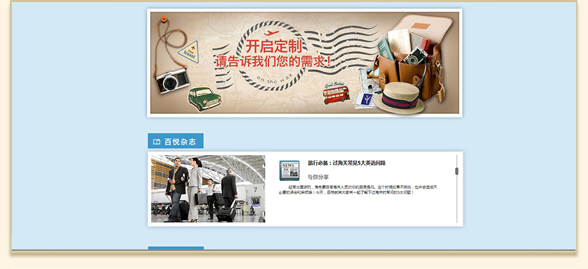 Project Description 百悦逸游于2012年初由二位资深的旅行家创办,是成都传媒集团旗下成都新闻国际旅行社有限公司的高端旅游品牌,总部位于成都高新区天府大道中段美年广场。在百悦逸游成立之前,创始团队亲自到全球三十多个国家实地考察,带着第一手的资讯和执着的信念创立了中国西部第一家真正意义上的私人定制旅行机构。百悦的旅行不是跟团挤大巴,不是十天去十个国家,更不是没完没了的... Official website address 南川http://www.100.travel I want to share